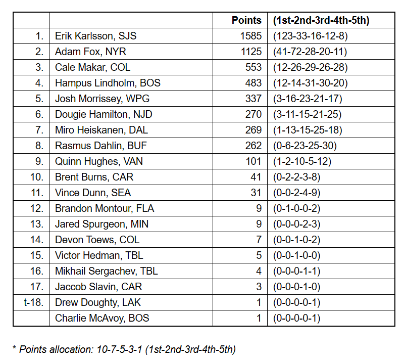 Of the votes I had, I thought this one was mostly easy to put together. McDavid had an all-universe season. Some apt, yet inconsequential, mistakes surfaced by digging through the numbers, but it was important to recognize that offense powered the NHL and McDavid was the superior offensive producer on a team that also excelled at scoring.