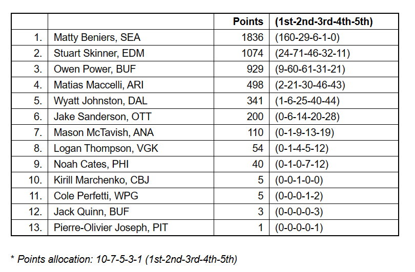 Playing defense in the NHL is as difficult as it gets and I tend to give a lot more leeway to rookie defensemen who stand out in their first seasons. And none of this is said to diminish what Beniers did being the best rookie scorer in the league. But this is also how Jake Sanderson wound up third on my ballot as well. After all, Power and Sanderson’s impacts were very similar and if I’m voting for one highly I’m voting for the other high up as well.